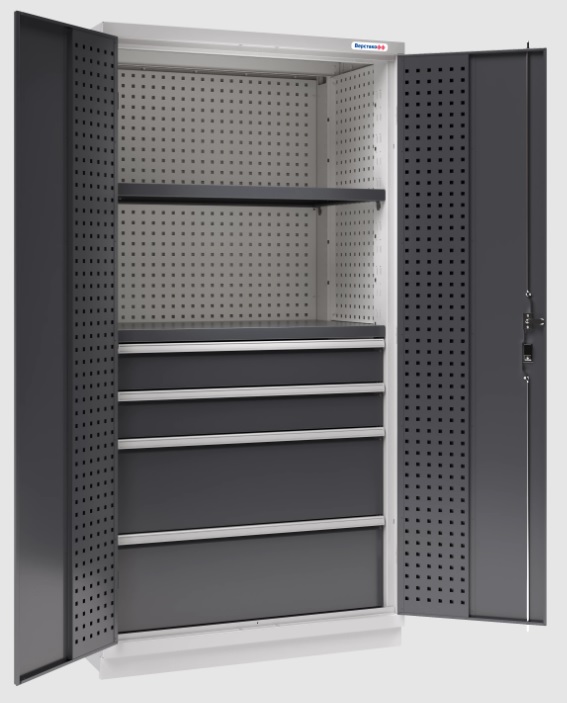 Цвет: корпус, перфорированные панели съемные - RAL7047 (серый), глянец; двери, лицевые панели ящиков, полки - RAL7024 (серый), глянец.