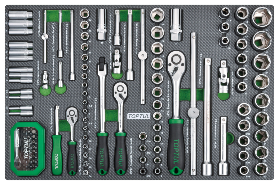 Набор головок и аксессуаров ,1/4",3/8",1/2" 6-гр.,126 пр. в мягком ложементе TOPTUL