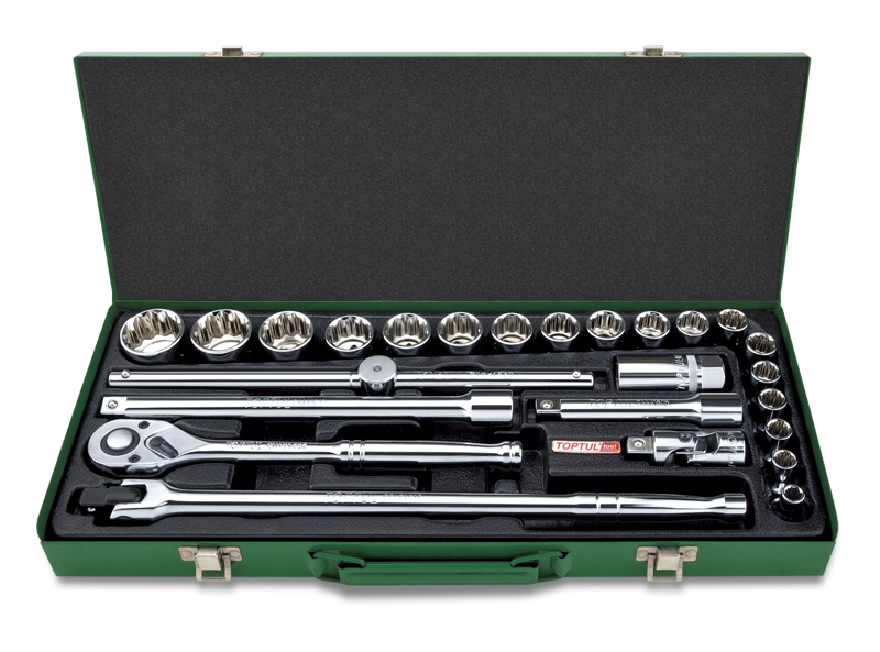 Набор головок и аксессуаров 1/2" 12-гранных дюймовых 5/16"-1-1/4", 25 предметов в метал. кейсе TOPTUL